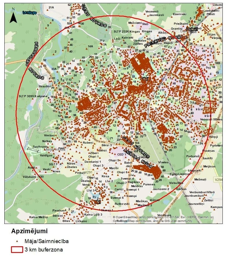 Gadījumos, kad vairāki perēkļi atrodas nelielos attālumos, buferzonas pārklājas un apvienojas. Lielākās buferzonu platības ir Jelgavas novadā. Informācija par apdzīvotām vietām un pagastiem, kuros atrodas perēkļi un ietilpst to buferzonas, apkopota zemāk sniegtajā tabulā.