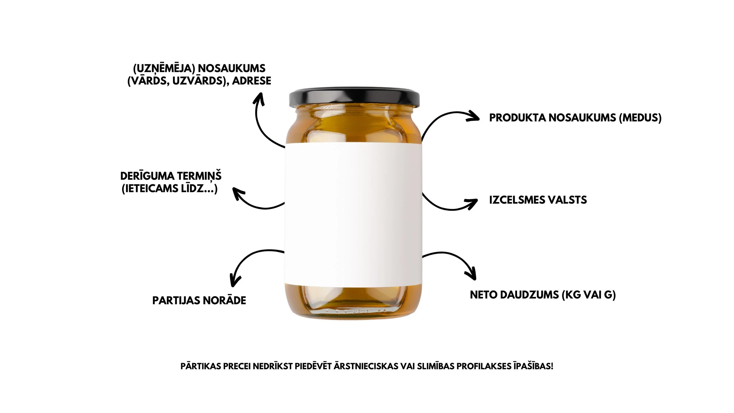 Uz etiķetes nedrīkst rakstīt, ka medus ir veselīgs, bioloģiski aktīvs, ārstniecisks, kā arī piedēvēt dažādas citas slimību aizsargājošas un veselību stimulējošas īpašības, kuru patiesumu var uzskatīt par nepierādītu vai kurām ir mītiska izcelsme. Neskatoties uz to, mēs visi zinām, ka medus ir gadu tūkstošos lietots ārstniecisks produkts, kuru arī mūsdienās lieto kā zāles, taču, ja tas tiek ražots un marķēts kā pārtikas produkts, tad tā marķējumam jāatbilst pārtikas produktiem noteiktajām marķēšanas prasībām.