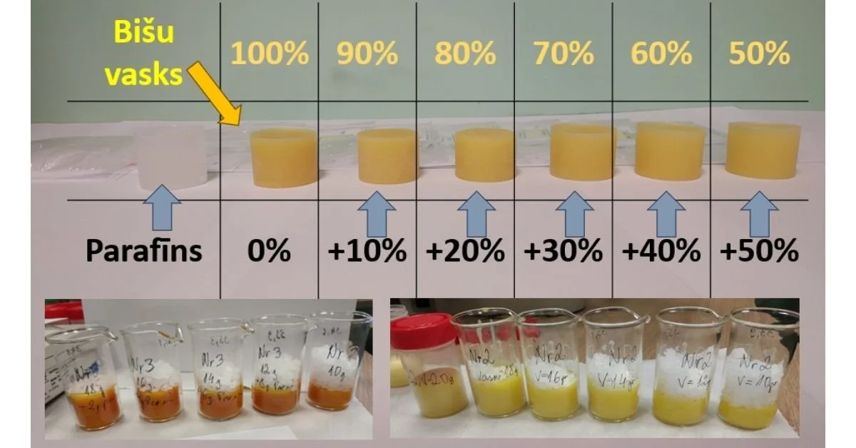 Lai saprastu, kā piejaukumi ietekmē dabīga vaska īpašības, pētījumā tika sagatavoti paraugi ar dažādu parafīna, stearīna un rapšu eļļas piejaukumu (no 10 % līdz pat 50 %). Eksperimenti apliecināja: palielinoties šo piemaisījumu daudzumam, vasks pakāpeniski zaudē savas unikālās īpašības – mainās tā krāsa, lūzuma struktūra un izturība.