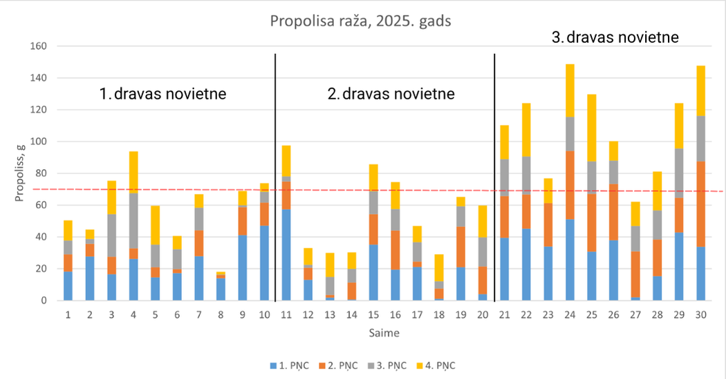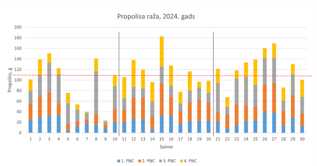 Analizējot datus par katru pētījumā iesaistīto saimi, tika konstatētas būtiskas atšķirības propolisa ražībā. Tās skaidrojamas ar izmantoto bišu māšu ģenētiku: pirmajā dravas novietnē dravots ar Buckfast bišu mātēm, kurām propolisa vākšana nav izteikti raksturīga; otrajā novietnē izmantotas gan Buckfast, gan Karnika bišu mātes savukārt trešajā dravas novietnē dravots tikai ar Karnika bišu mātēm.