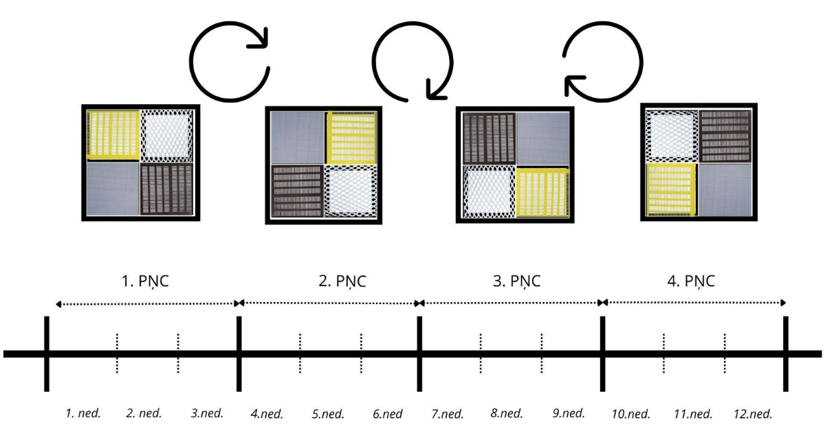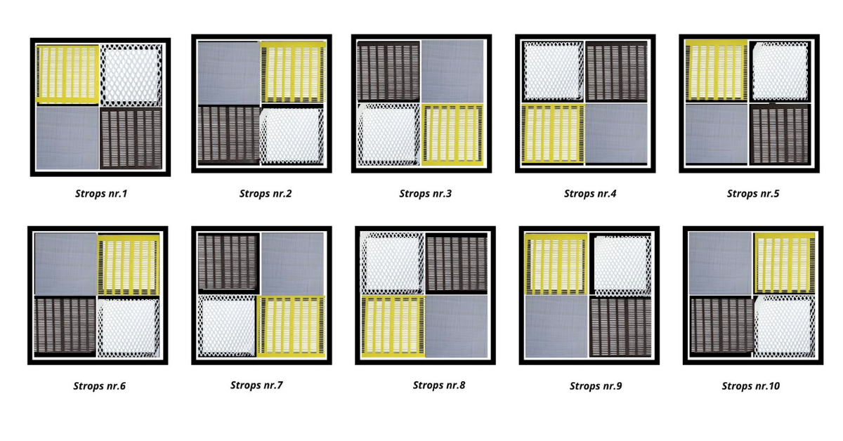 Katrā dravas novietnē propolisa sieti tika izvietoti stropiem atšķirīgās pozīcijās. Katram nākamajam stropam sietu novietojums tika pagriezts pulksteņrādītāja virzienā par vienu pozīciju.
